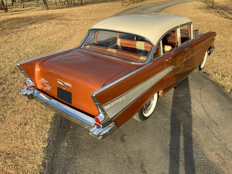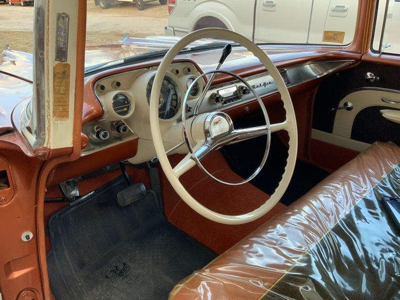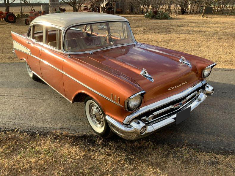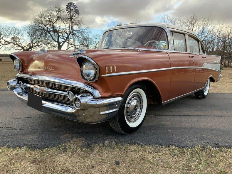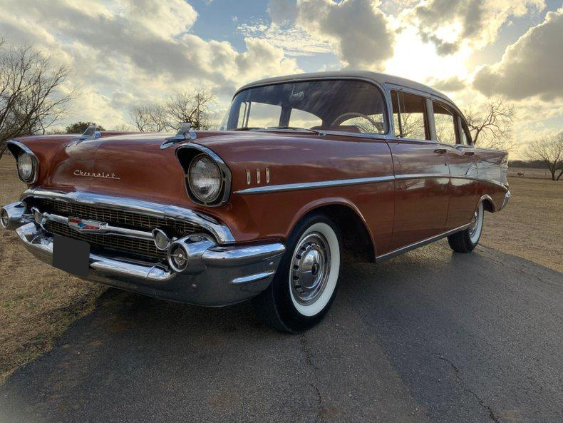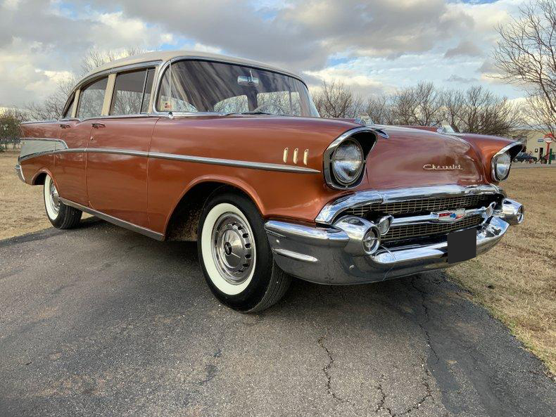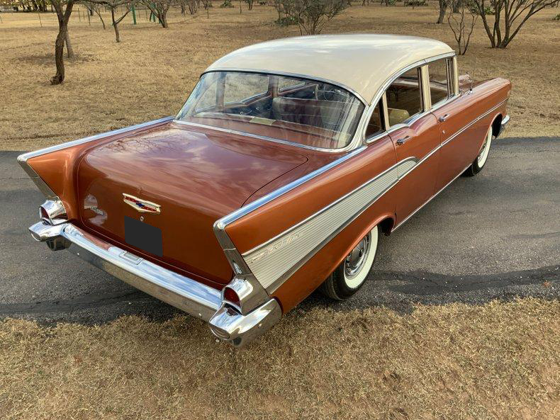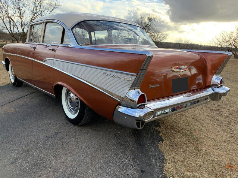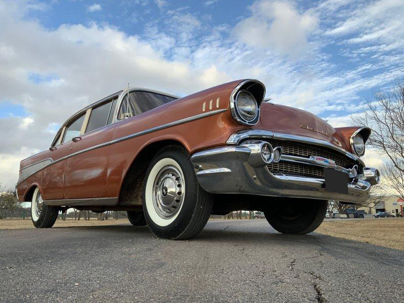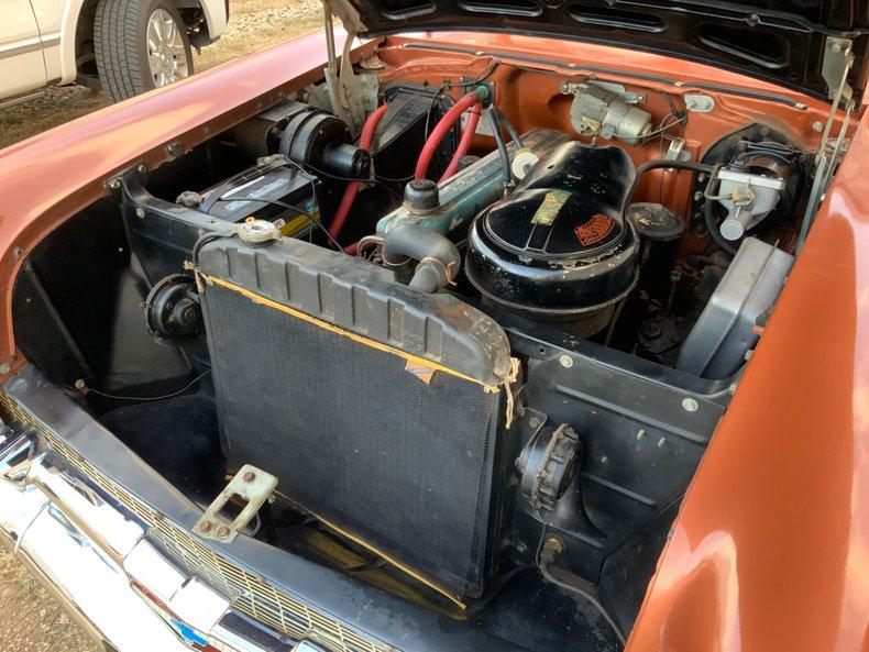 Additional features include factory power brakes, AM radio, and a new fuel tank. Clues to this jewel's originality include OEM spiral shocks, original radiator (3136570, DC July, 1957), all glass has 1957 date codes (T), both headlights are T3, correct red oxide primer on pans, no paint overspray, and various labels and stickers. Also, the previous owner has had the car since 1981(!) and stated that he had accumulated about 100 miles in 39 years.
