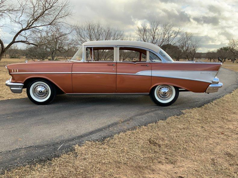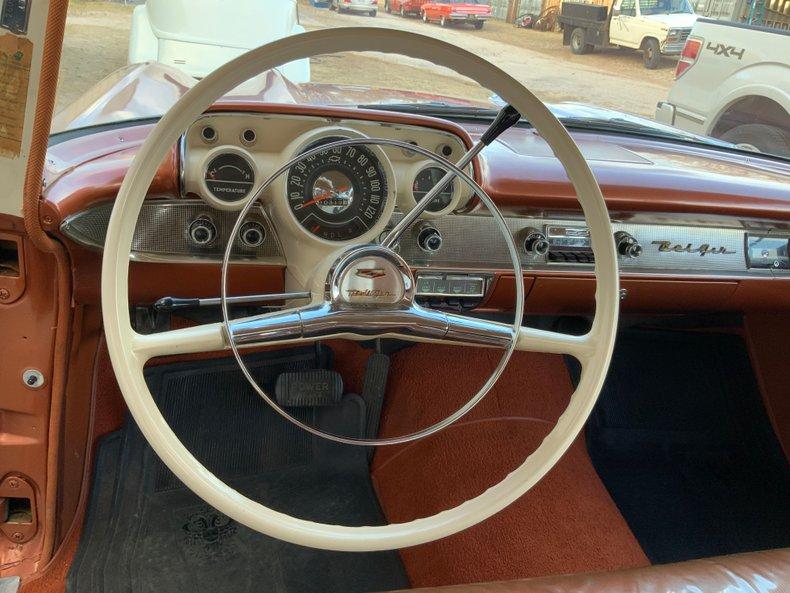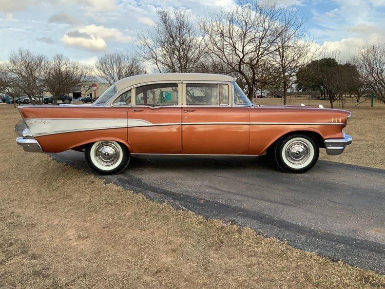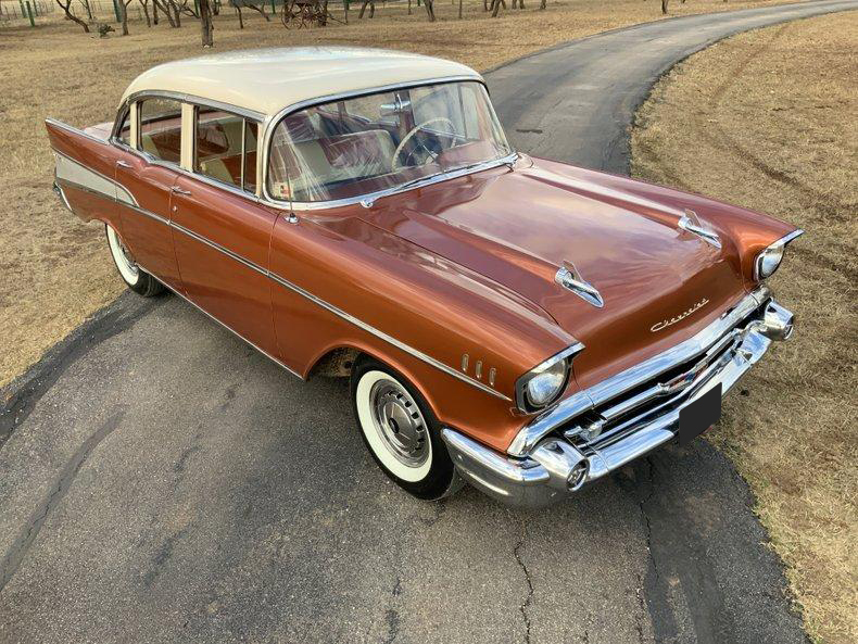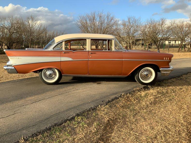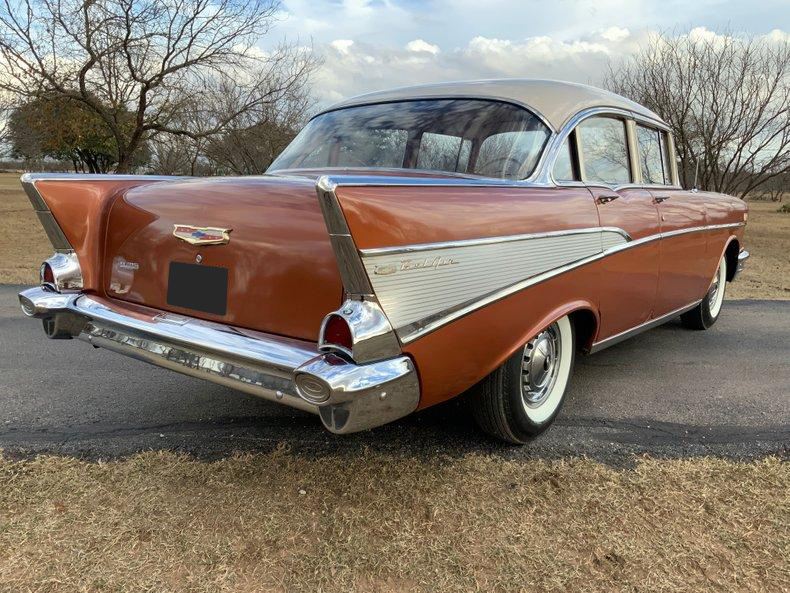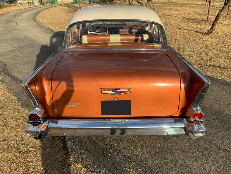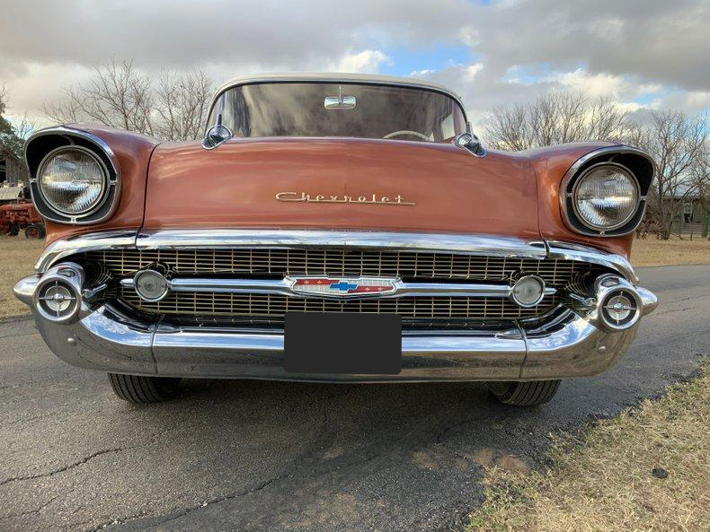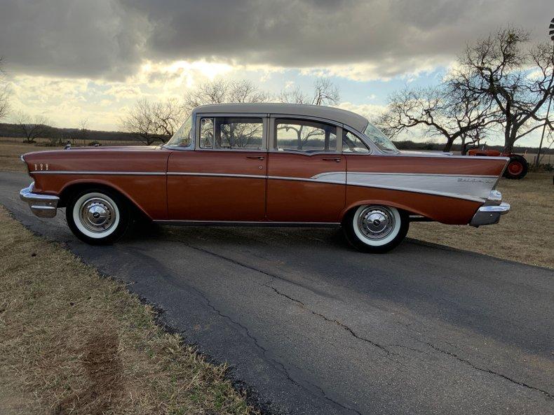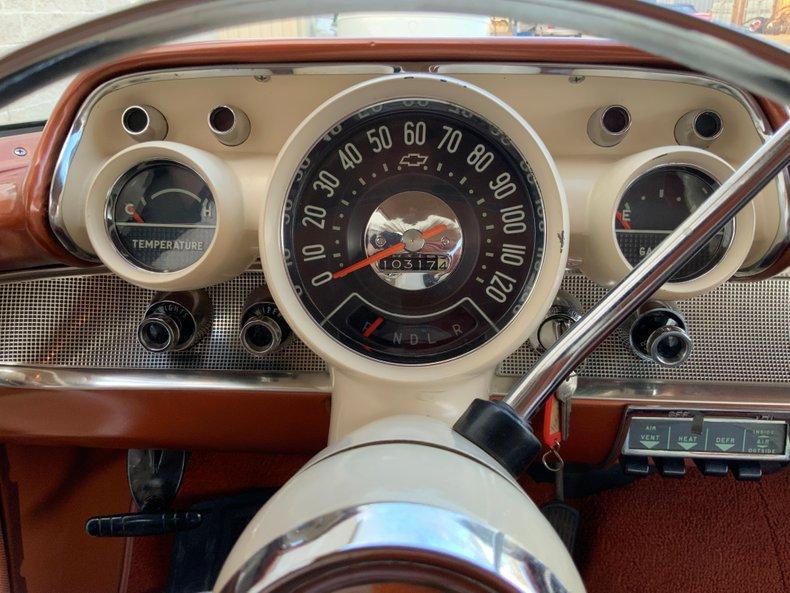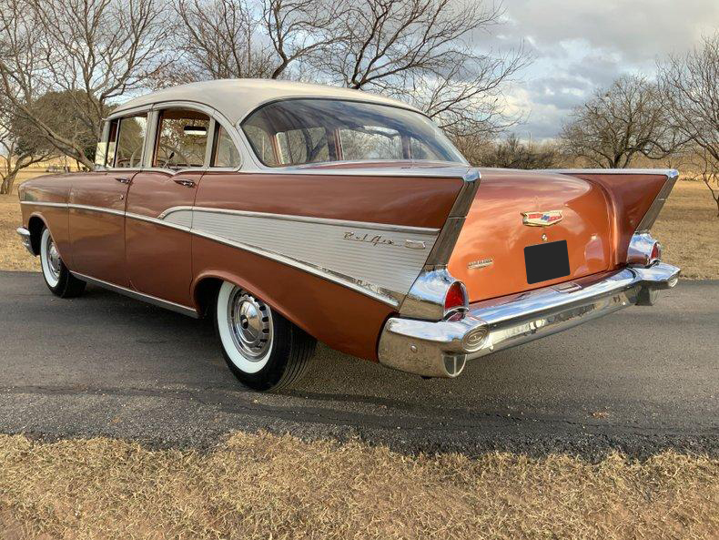 Additional features include factory power brakes, AM radio, and a new fuel tank. Clues to this jewel's originality include OEM spiral shocks, original radiator (3136570, DC July, 1957), all glass has 1957 date codes (T), both headlights are T3, correct red oxide primer on pans, no paint overspray, and various labels and stickers. Also, the previous owner has had the car since 1981(!) and stated that he had accumulated about 100 miles in 39 years.