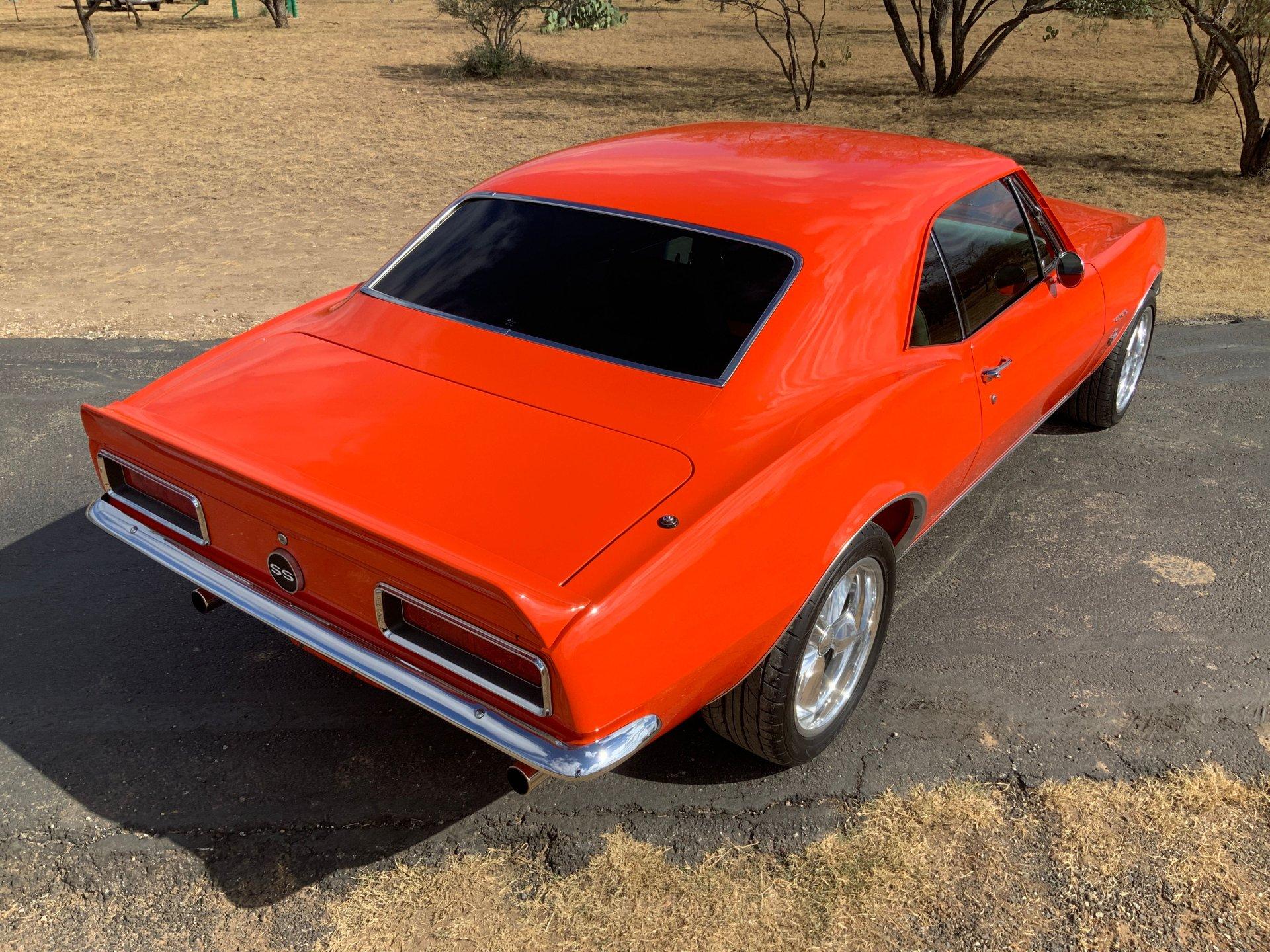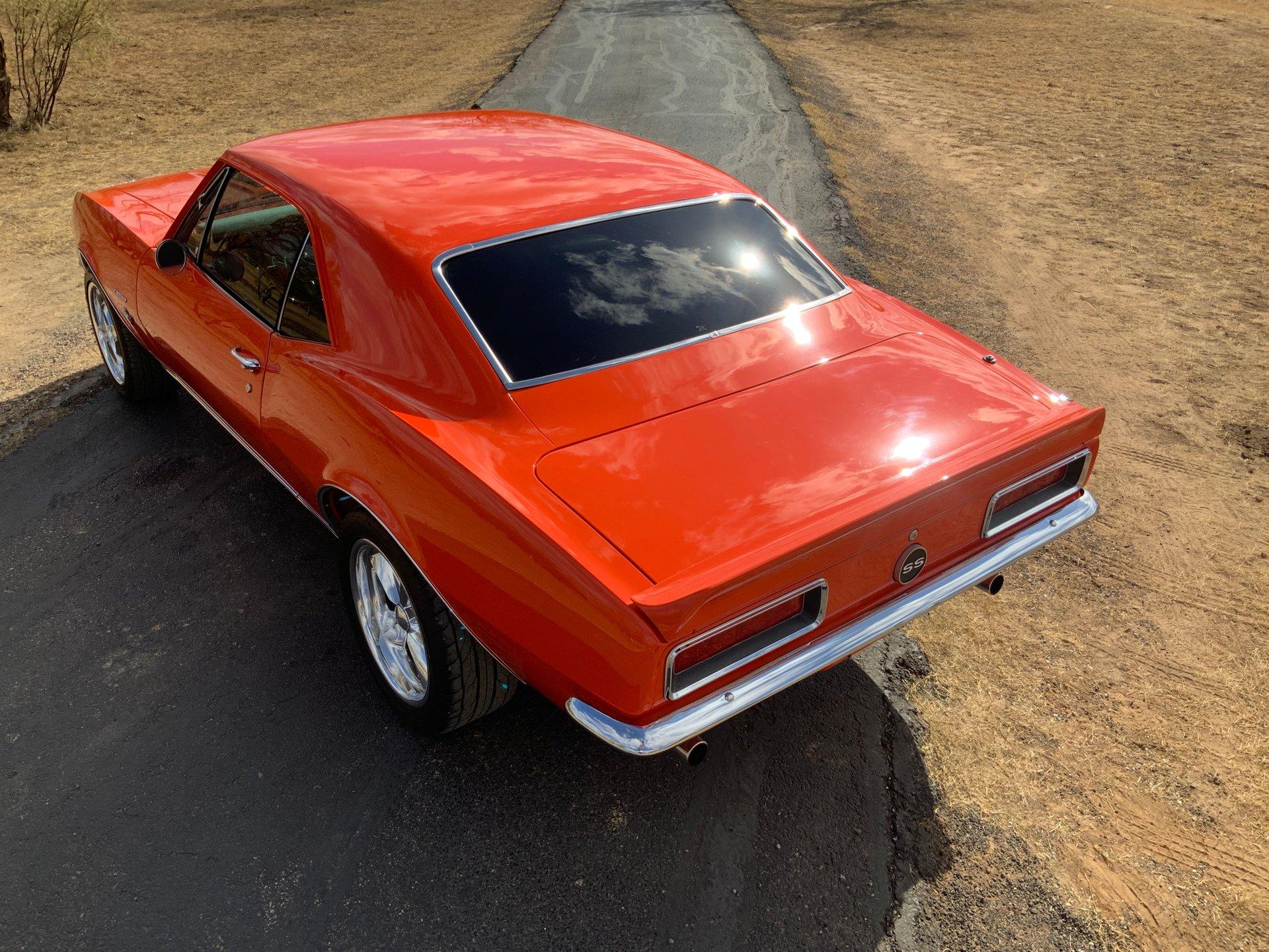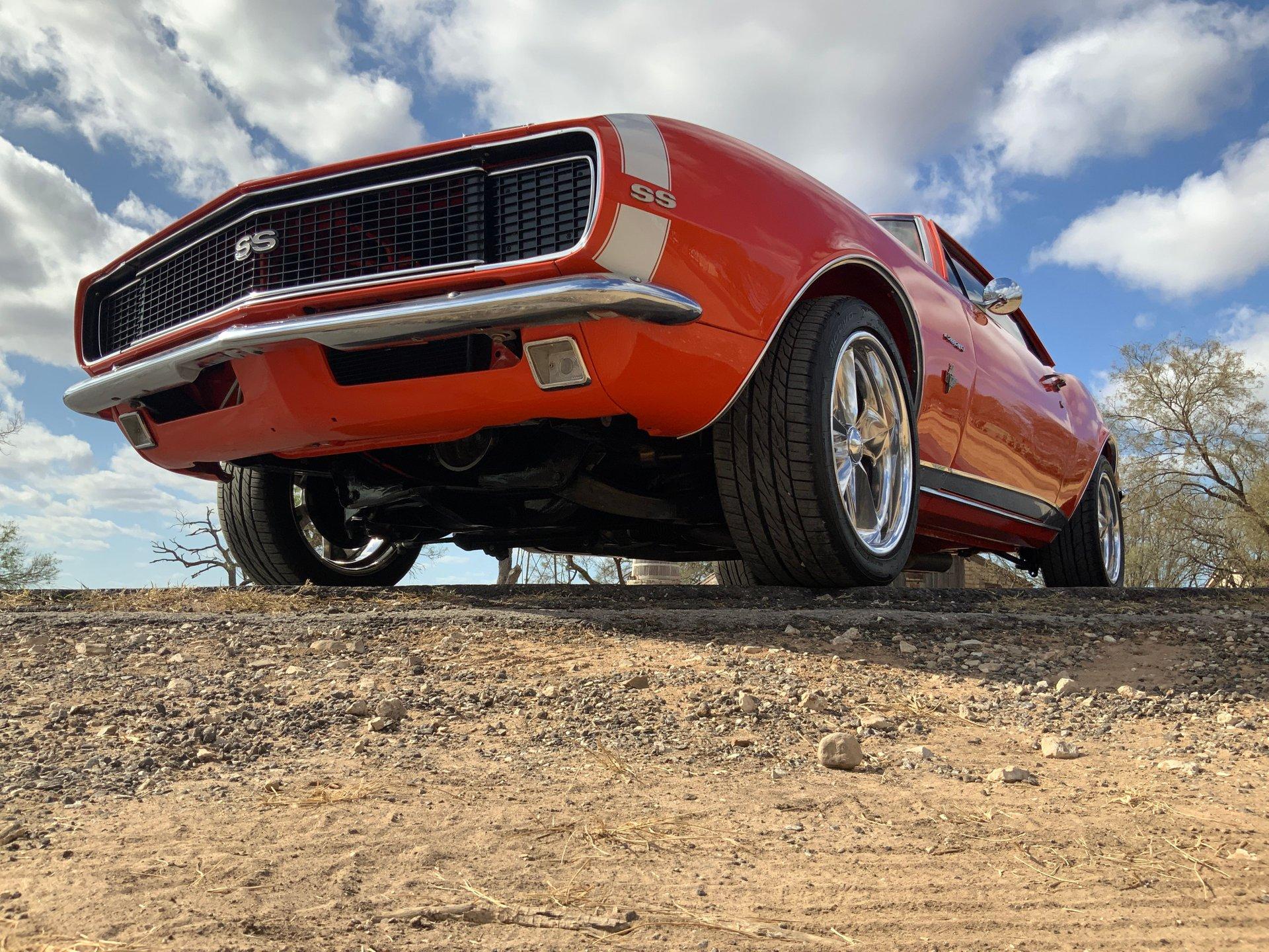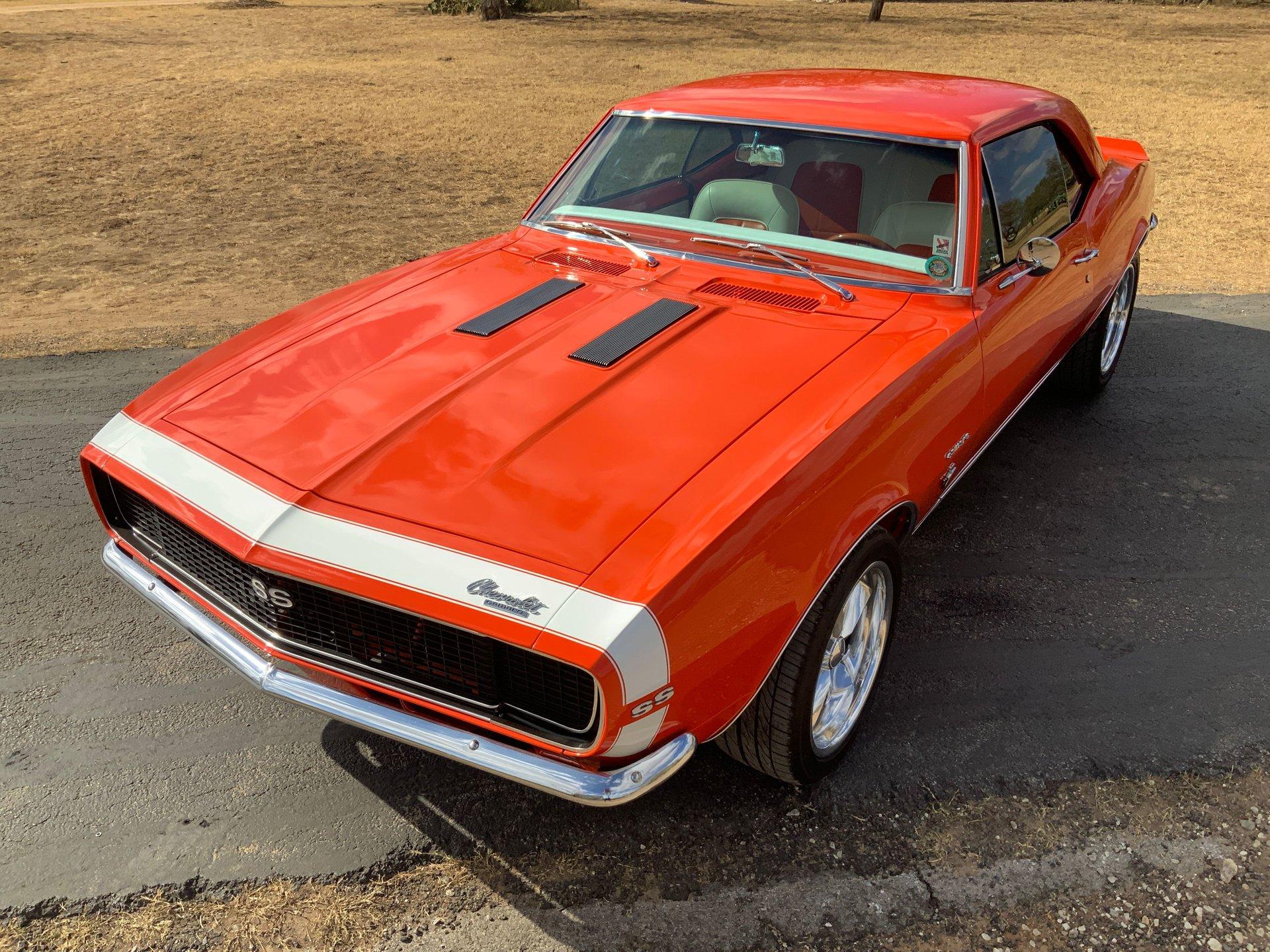This magnificent Hugger Orange 1967 Camaro RS/SS is capable of performing all 3 of those tasks with aplomb. Lift the stylish hood and you'll find a strong Chevy ZZ4 350 V8 crate engine that's sporting an Edelbrock carburetor, a Griffin aluminum radiator with dual SPAL fans and shroud, an aluminum water pump, MSD ignition, and a Front Runner accessory drive system. Additional features include Steeroids power rack and pinion steering, power front disc brakes, Vintage Air A/C, Tremec TKO600 5-speed manual transmission, 12-bolt rear end with 3.73 Posi gears, a Heidts 4-link rear suspension with adjustable coilovers, premium Del-A-Lum bushings, a Painless Performance wiring harness and fuse box, Dynamat insulation on floors, doors, and roof, a powder coated subframe, Gator Guard bed liner on floor and trunk pans, SoffSeal weatherstripping, a Kenwood audio system, Ididit tilt steering column with custom wood wheel, Dakota Digital gauges, and Foose alloy wheels wearing Nitto shoes (225/45ZR17 F, 245/45ZR17 R). During its professional rotisserie restoration new paint, chrome mouldings, front and rear glass, carpets, seats, headliner and door panels were installed.