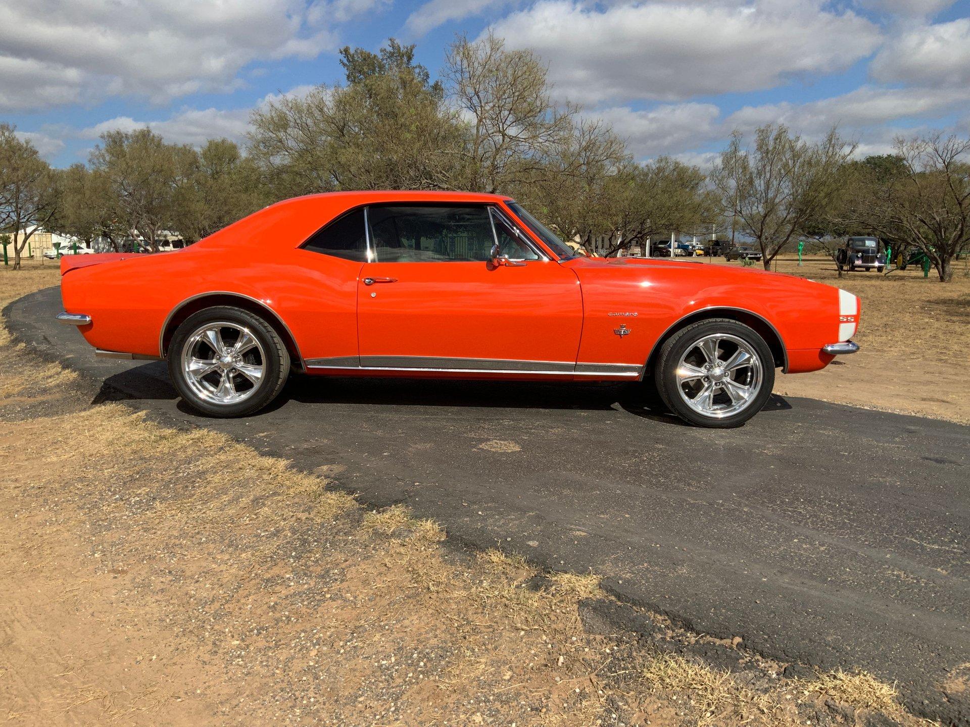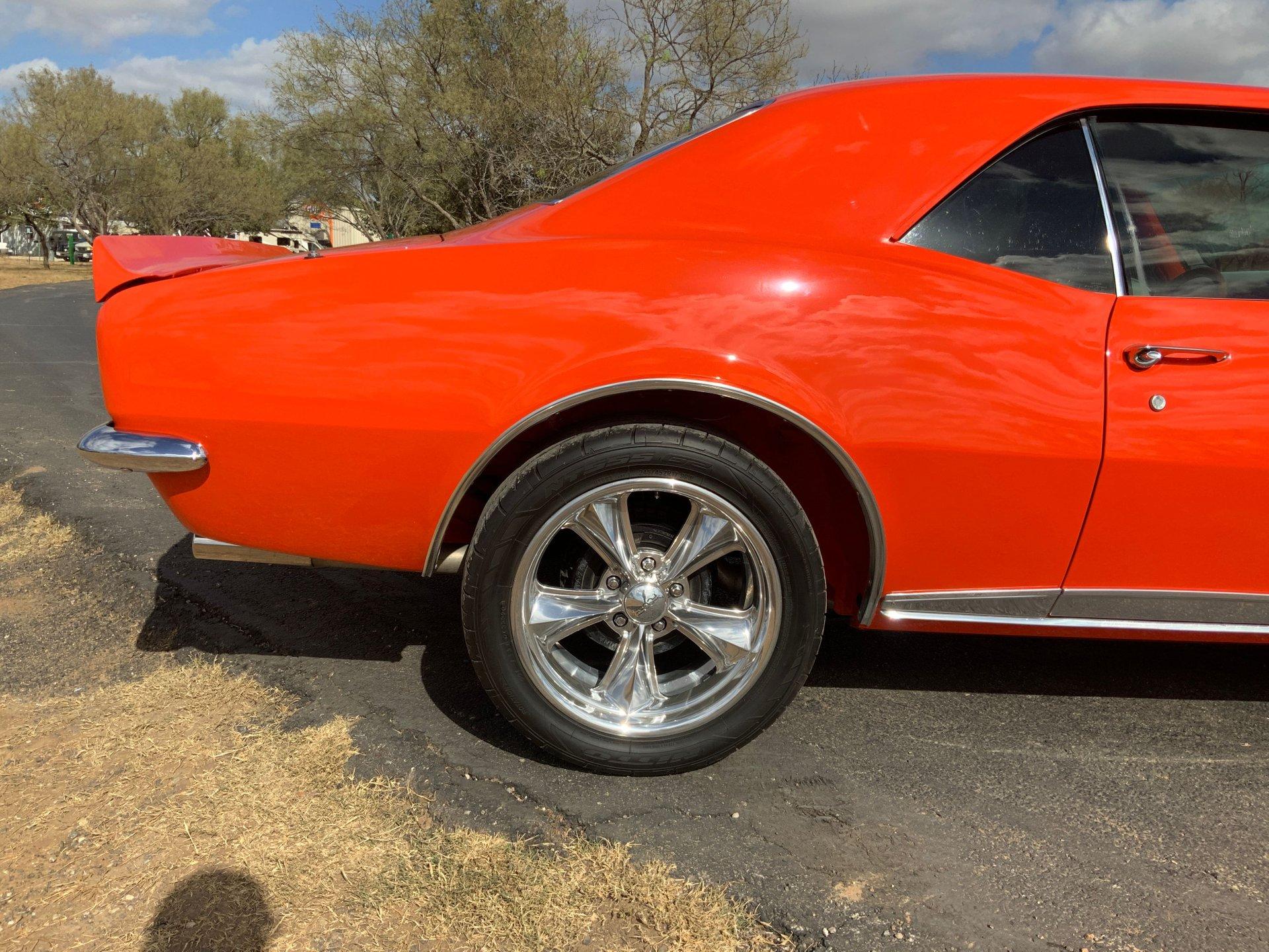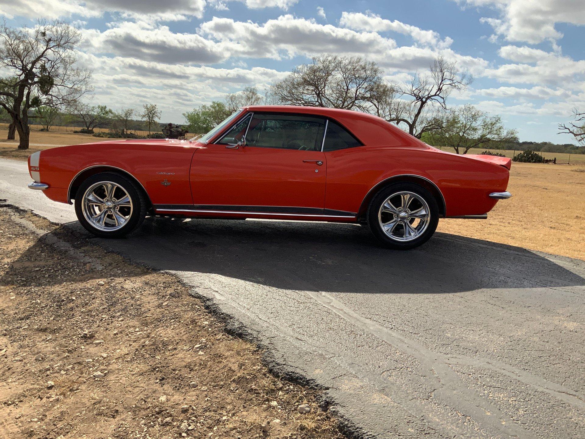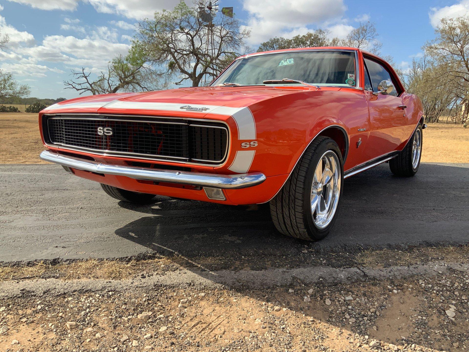 This magnificent Hugger Orange 1967 Camaro RS/SS is capable of performing all 3 of those tasks with aplomb. Lift the stylish hood and you'll find a strong Chevy ZZ4 350 V8 crate engine that's sporting an Edelbrock carburetor, a Griffin aluminum radiator with dual SPAL fans and shroud, an aluminum water pump, MSD ignition, and a Front Runner accessory drive system. Additional features include Steeroids power rack and pinion steering, power front disc brakes, Vintage Air A/C, Tremec TKO600 5-speed manual transmission, 12-bolt rear end with 3.73 Posi gears, a Heidts 4-link rear suspension with adjustable coilovers, premium Del-A-Lum bushings, a Painless Performance wiring harness and fuse box, Dynamat insulation on floors, doors, and roof, a powder coated subframe, Gator Guard bed liner on floor and trunk pans, SoffSeal weatherstripping, a Kenwood audio system, Ididit tilt steering column with custom wood wheel, Dakota Digital gauges, and Foose alloy wheels wearing Nitto shoes (225/45ZR17 F, 245/45ZR17 R). During its professional rotisserie restoration new paint, chrome mouldings, front and rear glass, carpets, seats, headliner and door panels were installed.
