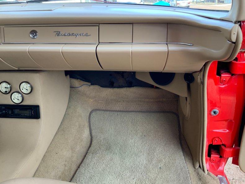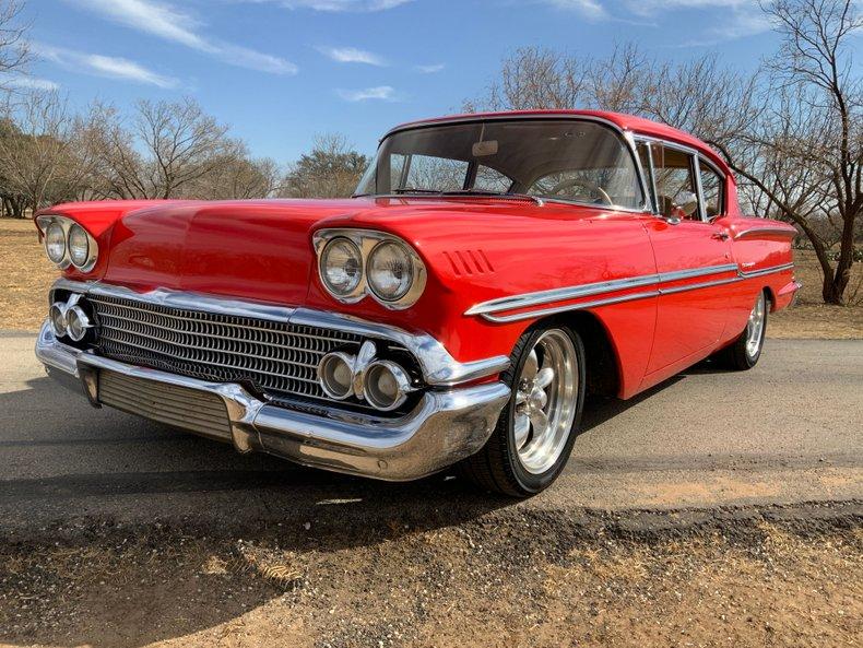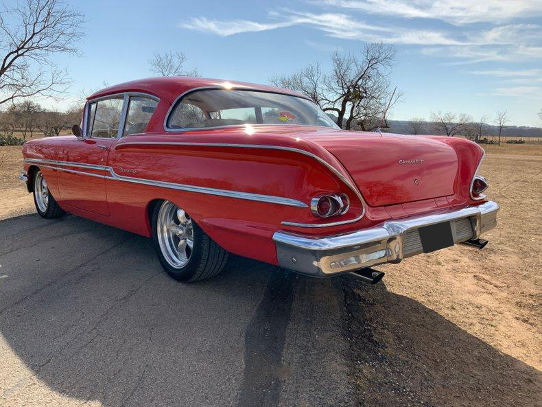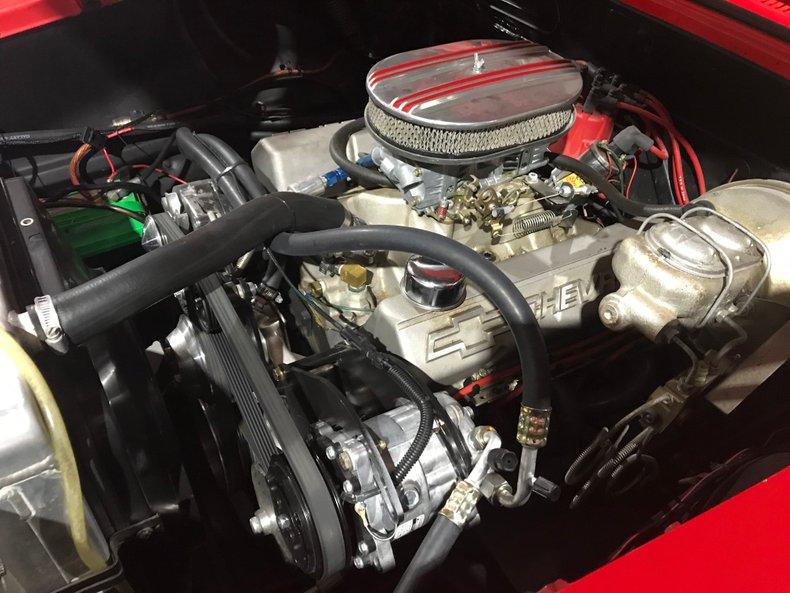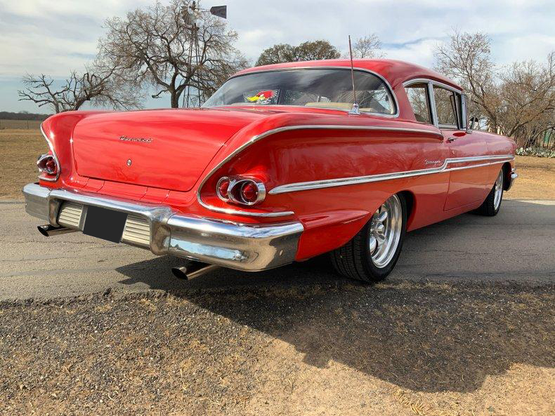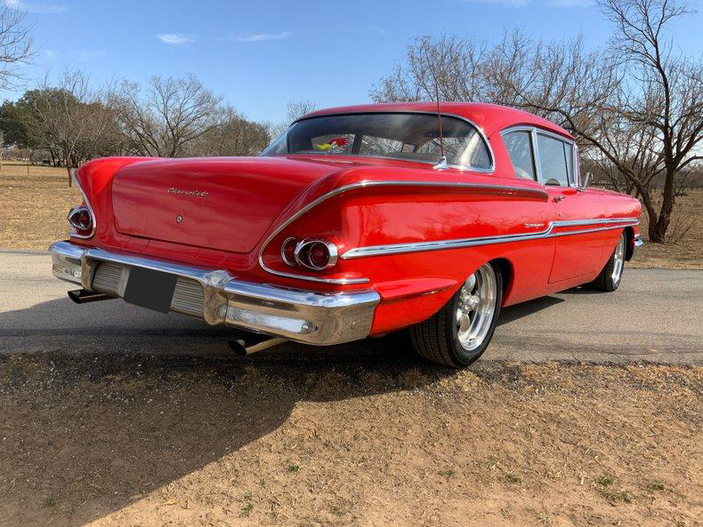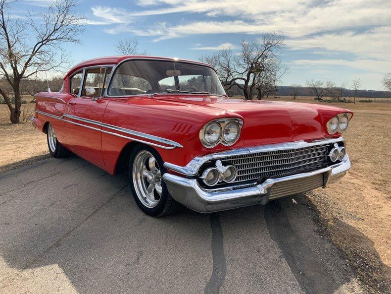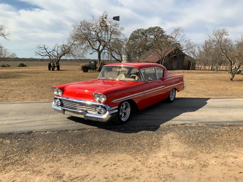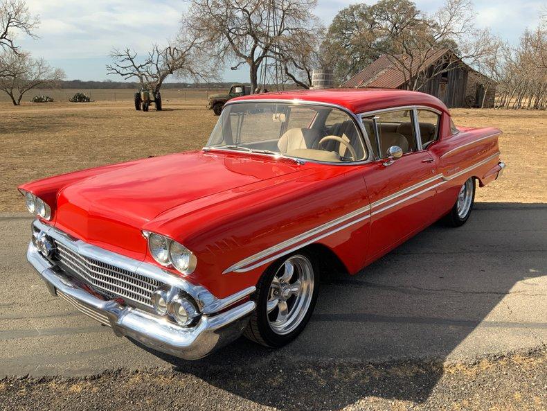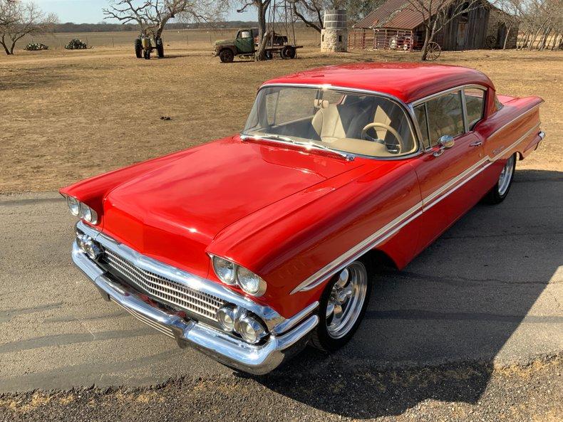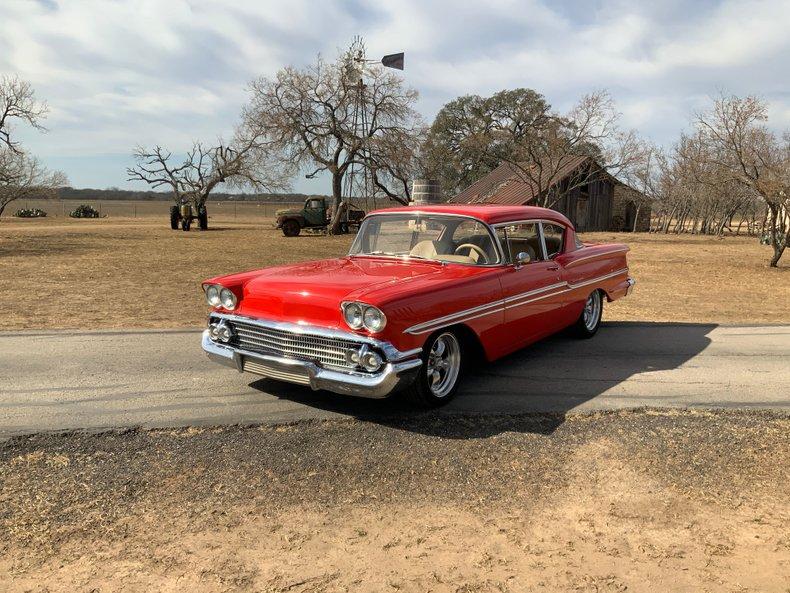 This cool 1958 Biscayne is no racer, but tasteful upgrades have resulted in a safer, more comfortable, and better performing automobile. Lift the hood and you'll be greeted by a healthy 350 V8 that's been fortified with a Holley carburetor, a GMPP aluminum intake manifold and heads, stainless steel headers, an aluminum water pump, and a Griffin aluminum radiator with an electric Flex-A-Lite fan and shroud. Additional features include power steering, power front disc brakes, a new Vintage Air A/C system, Muncie 4-speed manual transmission, a Ford 9" rear end, custom leather interior with a Lecarra leather wrapped steering wheel, tilt steering column, billet interior handles and cranks, a powerful audio system, and fresh tires (235/45R17 F, 245/50R17 R) wrapped around American Racing alloy wheels. This crimson cruiser is quite comfortable, with its compliant coil spring suspension and plush seating, and travels effortlessly at highway speeds.
