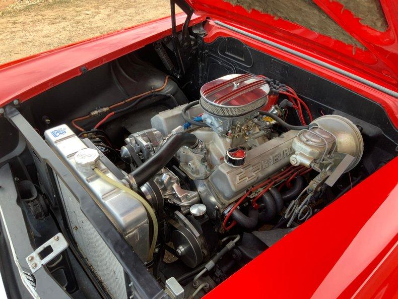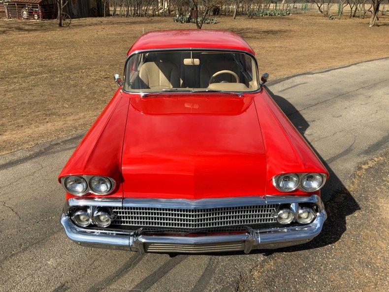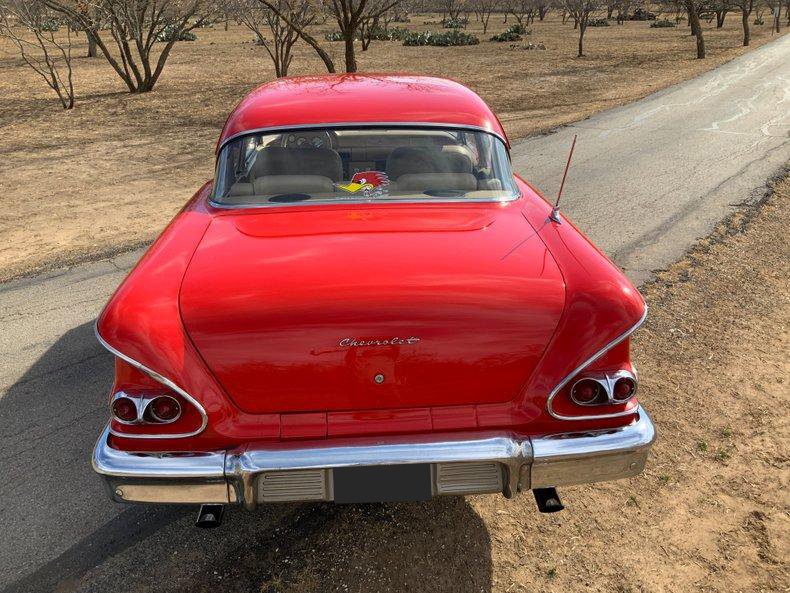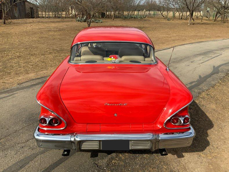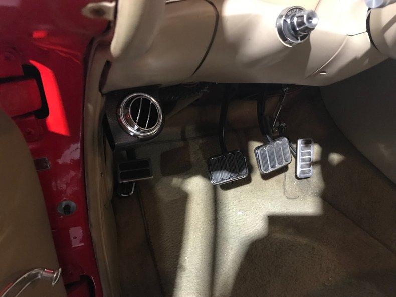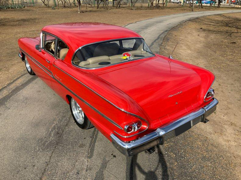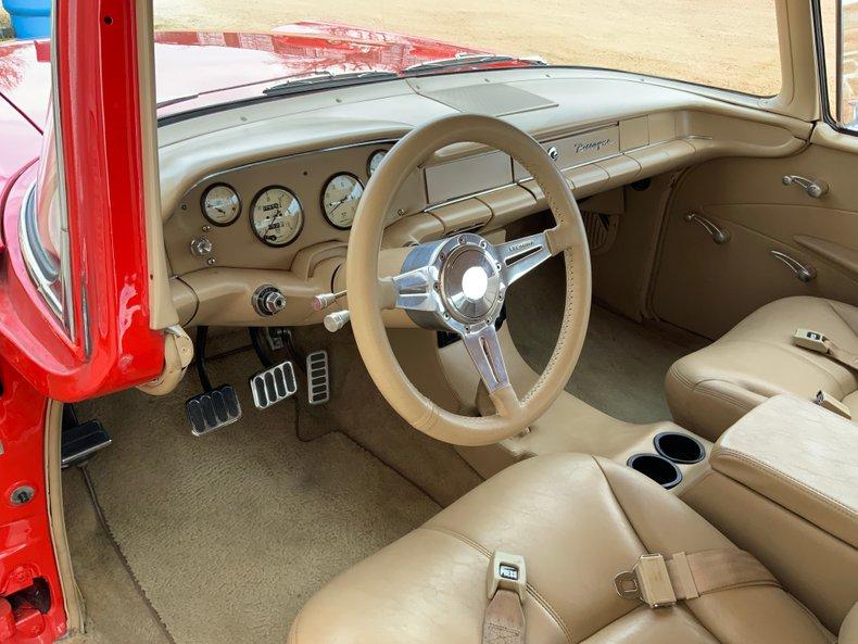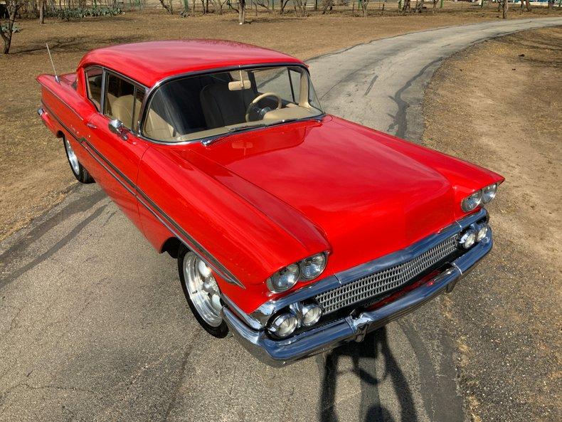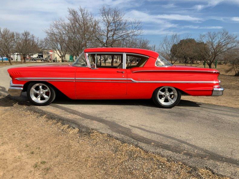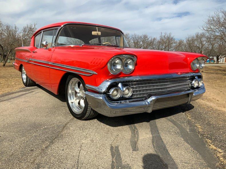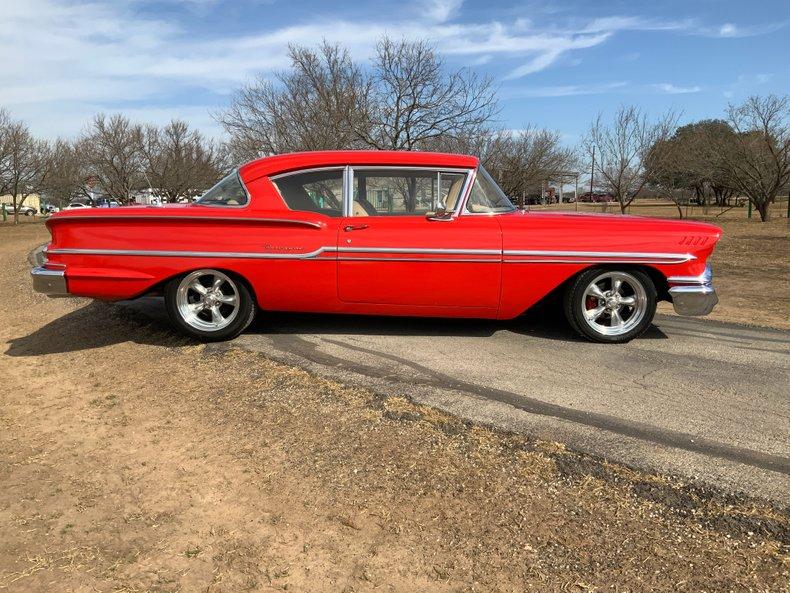 This cool 1958 Biscayne is no racer, but tasteful upgrades have resulted in a safer, more comfortable, and better performing automobile. Lift the hood and you'll be greeted by a healthy 350 V8 that's been fortified with a Holley carburetor, a GMPP aluminum intake manifold and heads, stainless steel headers, an aluminum water pump, and a Griffin aluminum radiator with an electric Flex-A-Lite fan and shroud. Additional features include power steering, power front disc brakes, a new Vintage Air A/C system, Muncie 4-speed manual transmission, a Ford 9" rear end, custom leather interior with a Lecarra leather wrapped steering wheel, tilt steering column, billet interior handles and cranks, a powerful audio system, and fresh tires (235/45R17 F, 245/50R17 R) wrapped around American Racing alloy wheels. This crimson cruiser is quite comfortable, with its compliant coil spring suspension and plush seating, and travels effortlessly at highway speeds.