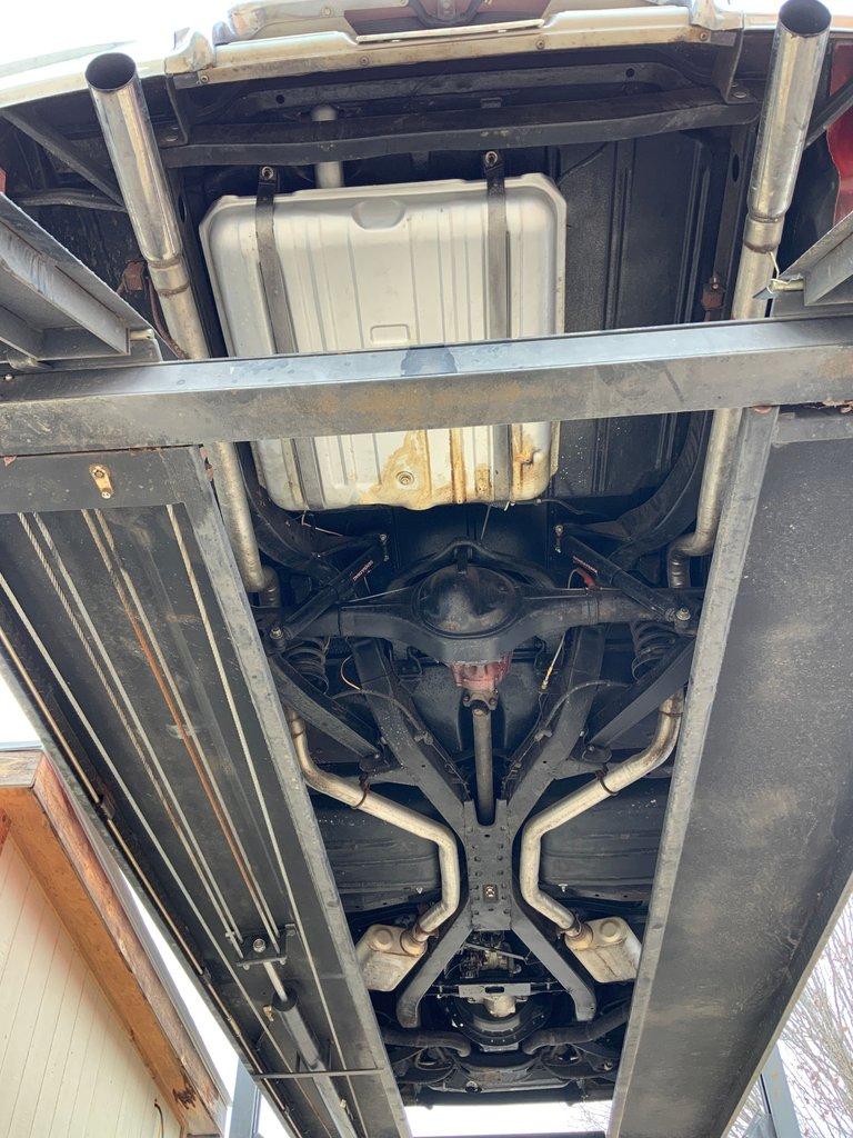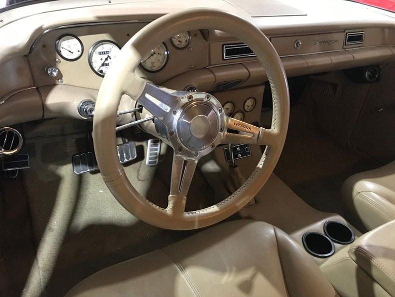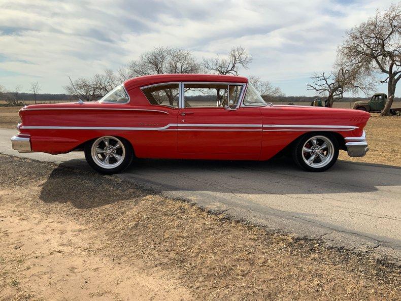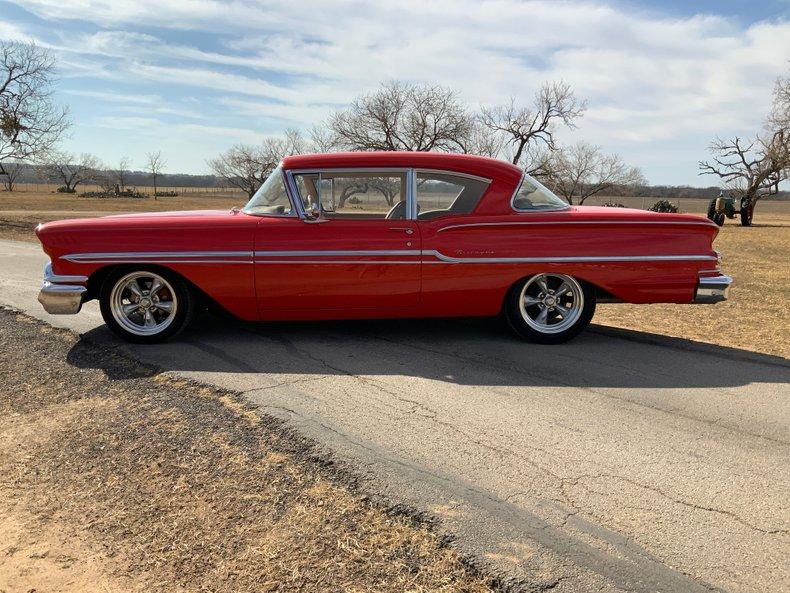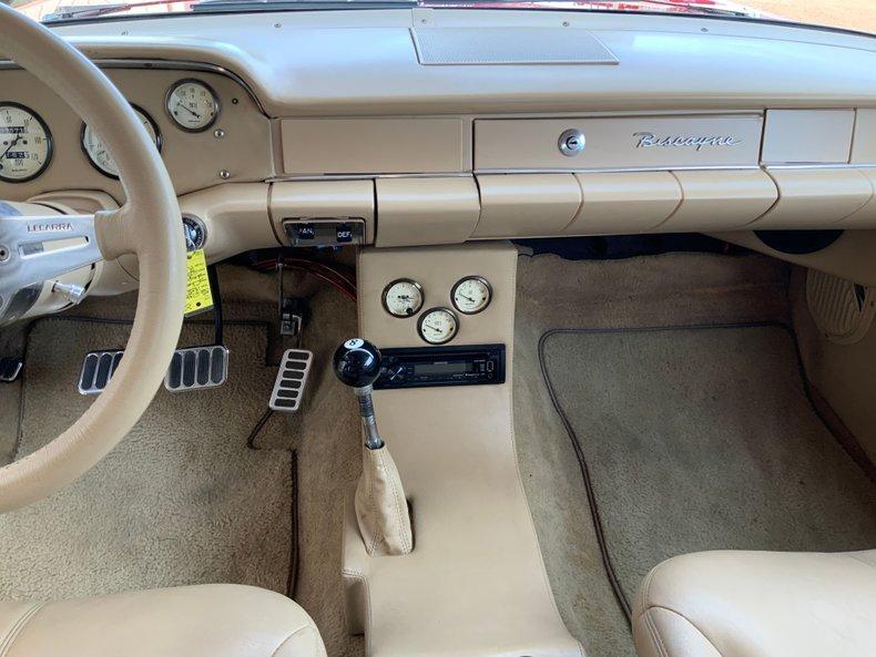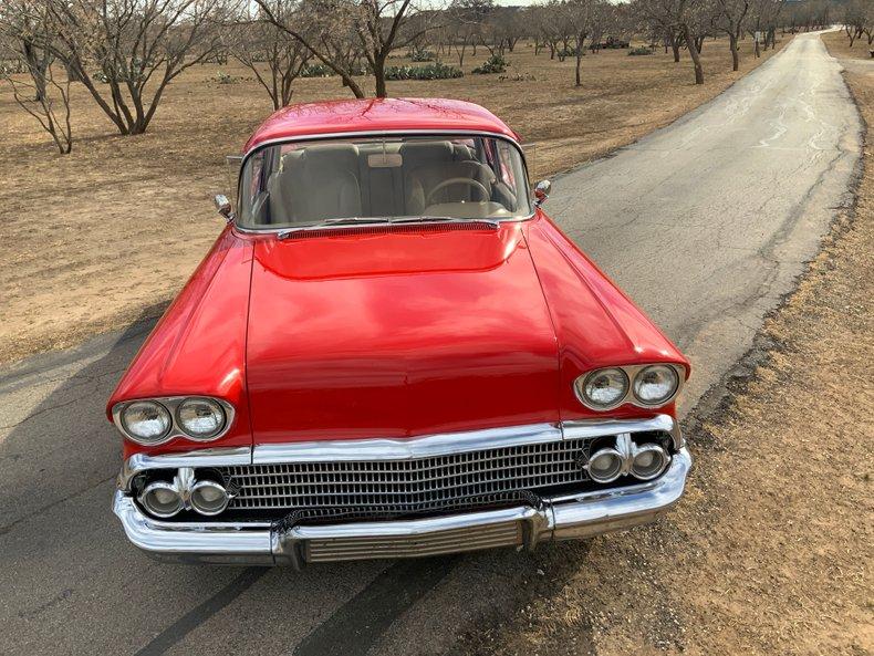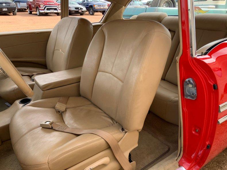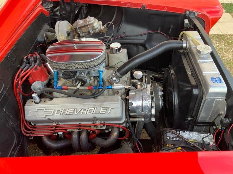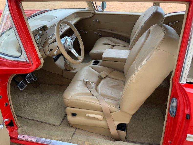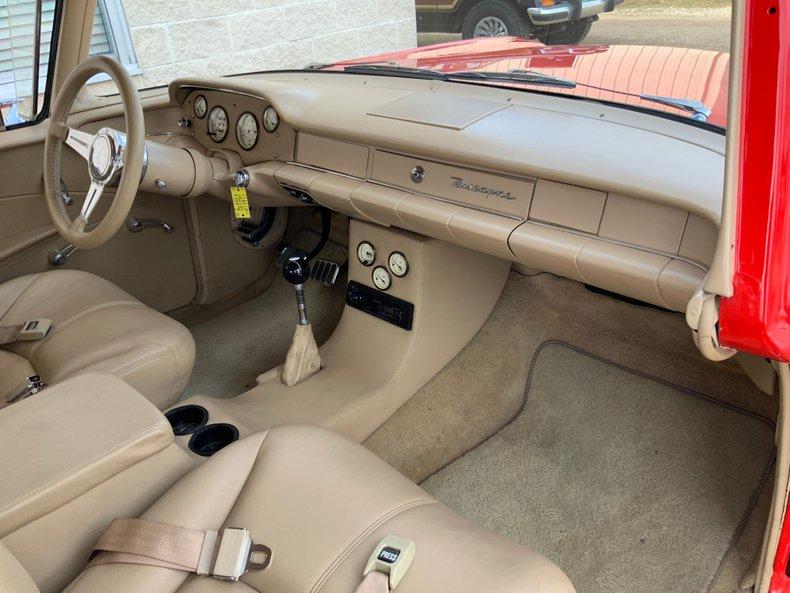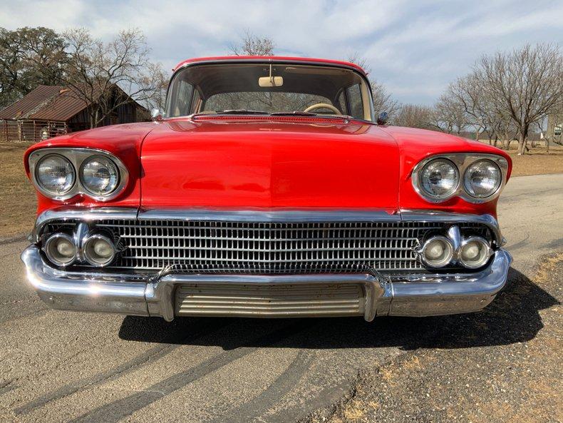 This cool 1958 Biscayne is no racer, but tasteful upgrades have resulted in a safer, more comfortable, and better performing automobile. Lift the hood and you'll be greeted by a healthy 350 V8 that's been fortified with a Holley carburetor, a GMPP aluminum intake manifold and heads, stainless steel headers, an aluminum water pump, and a Griffin aluminum radiator with an electric Flex-A-Lite fan and shroud. Additional features include power steering, power front disc brakes, a new Vintage Air A/C system, Muncie 4-speed manual transmission, a Ford 9" rear end, custom leather interior with a Lecarra leather wrapped steering wheel, tilt steering column, billet interior handles and cranks, a powerful audio system, and fresh tires (235/45R17 F, 245/50R17 R) wrapped around American Racing alloy wheels. This crimson cruiser is quite comfortable, with its compliant coil spring suspension and plush seating, and travels effortlessly at highway speeds.