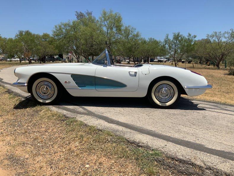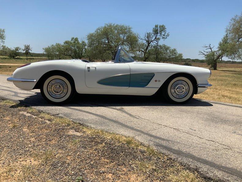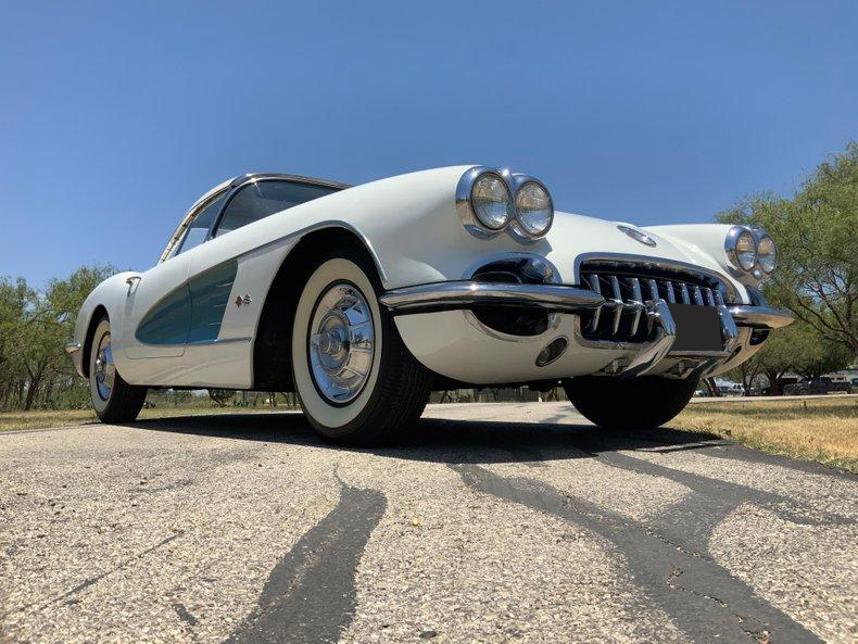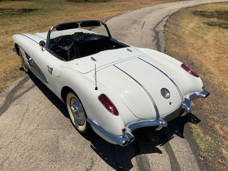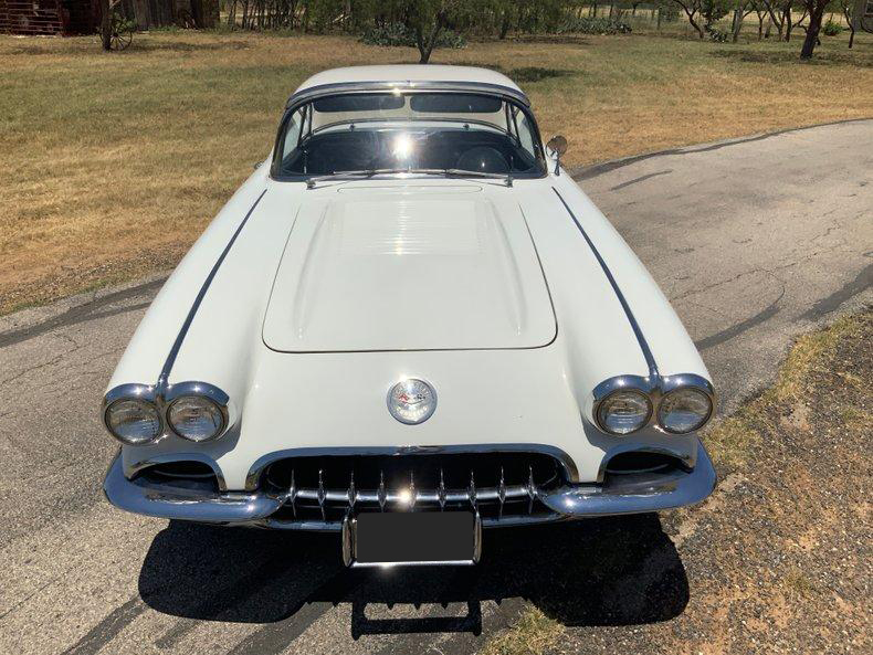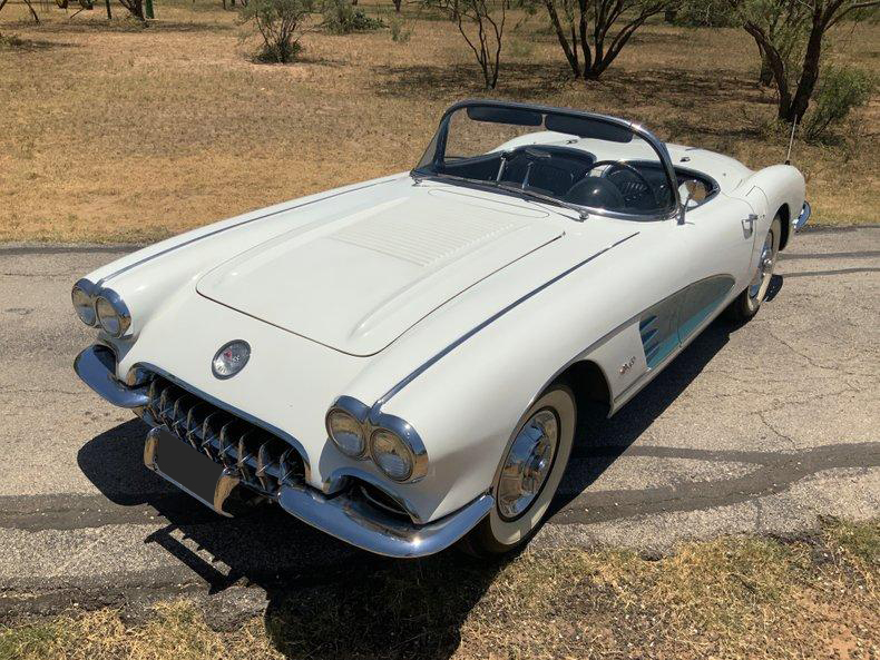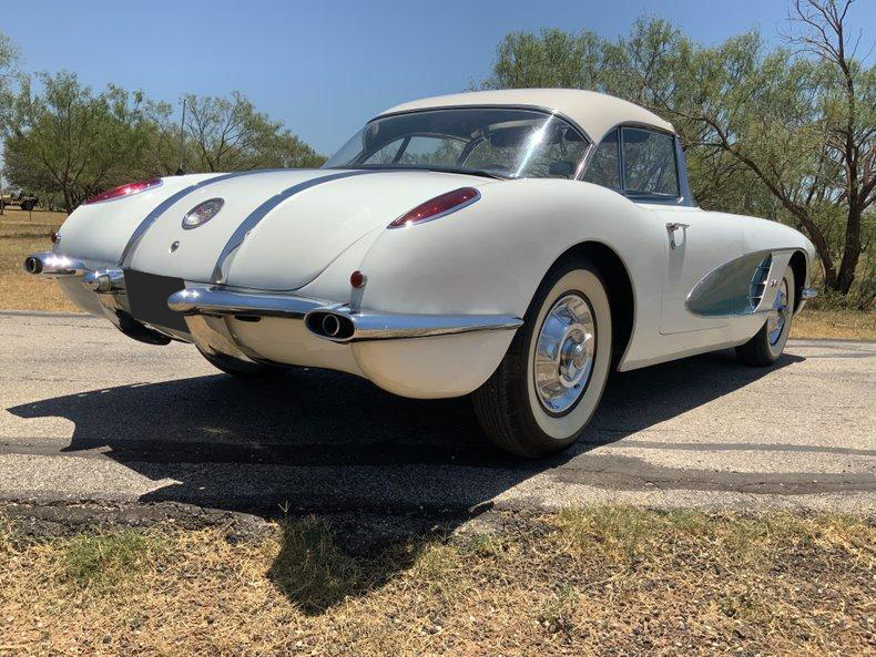 This beautiful 1958 Corvette benefits from the early performance upgrades, namely its 283 ci V8, but also enjoys some attractive features that only appeared in 1958. This smooth-running 283 is sporting a brand-new Edelbrock carburetor and thermostat for trouble-free cruising. Additional features include an automatic transmission, auxiliary hardtop, Wonderbar radio, and classic 6.70-15 wide whitewall tires mounted on steel wheels. Perhaps the 1958's most distinguishing feature is the pair of chrome trunk spears that begin at the rear bumper and continue almost to the rear window. These, the one-year-only louvered hood, and the first dual headlight treatment make 1958 Corvettes truly unique.